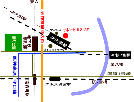 ・地下鉄堺筋線扇町駅下車 1番出口を左に曲がると目の前に天神橋筋商店街があります。商店街を左に入り約2分歩くとJR天満駅が有り。ここからは上記を参考にして下さい。