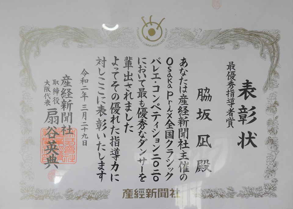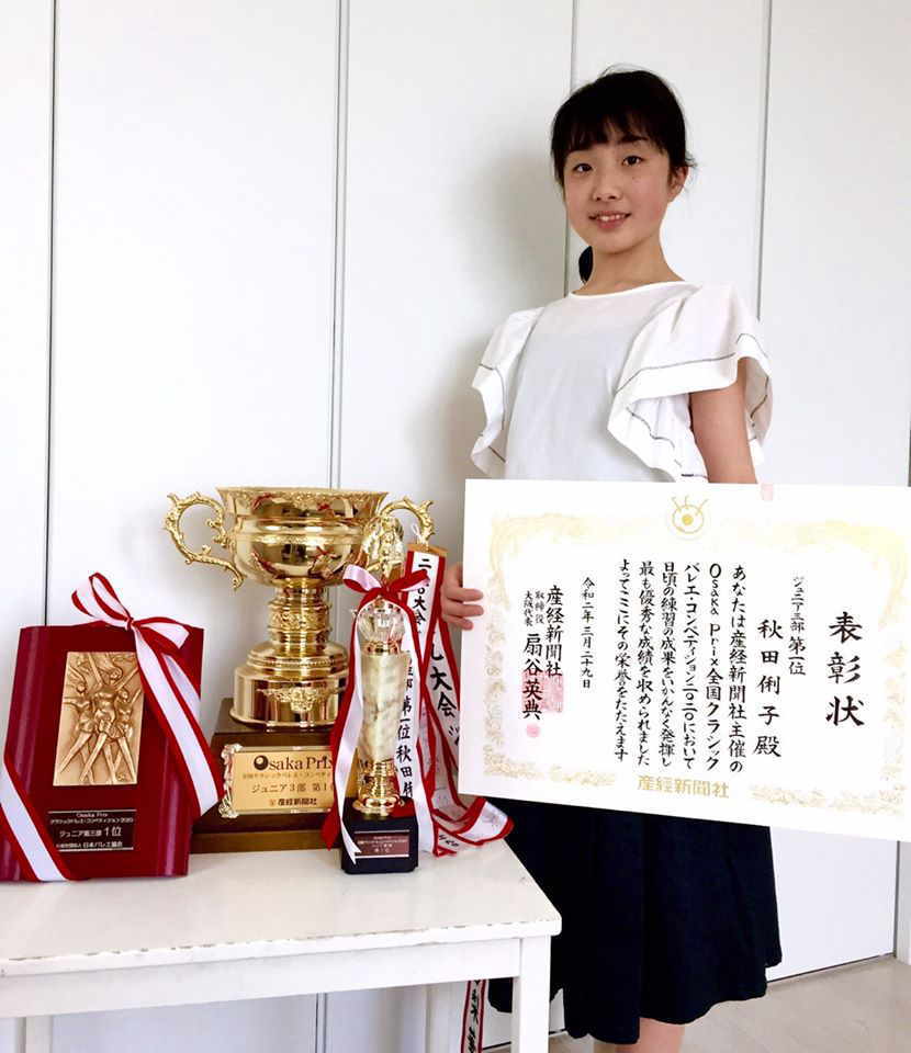 | コロナによるレッスン自粛の中でうれしいお知らせが 27日ー29日まで催されたOsakaPrix 全国クラシックバレエ・コンペティション、ジュニア3部に出場した六名のうち三名が決選へ。 その中、秋田俐子が見事第一位、全部門での最優秀賞を。 脇坂凪先生も最優秀指導者賞を受賞しましたおめでとう |