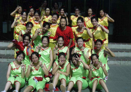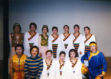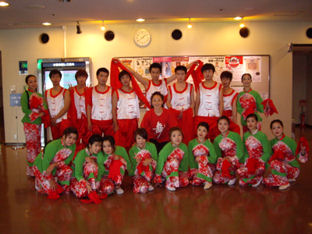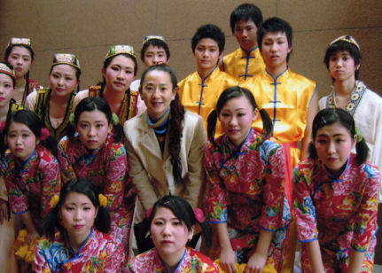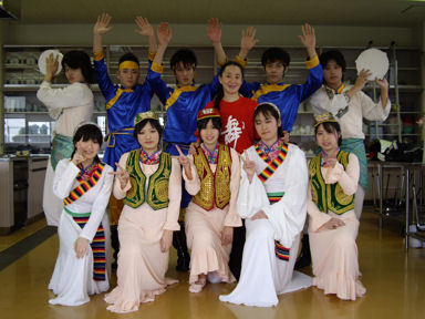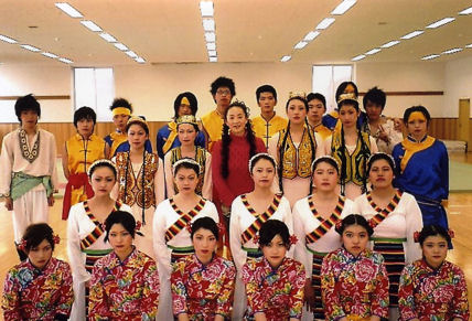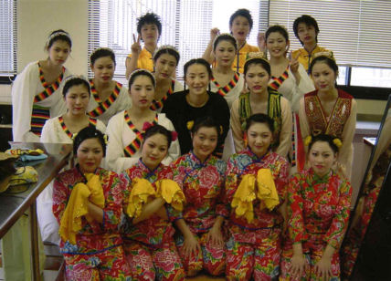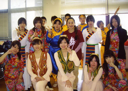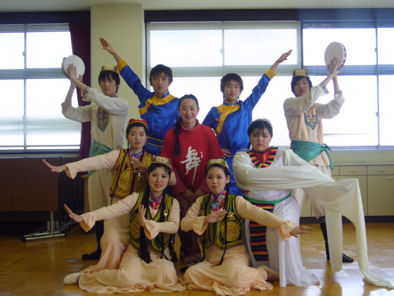 | 1. 舞踊、中国舞踊呼吸法ストレッチの振付指導と歌唱の指導。 ・学校の総合学習での中国舞踊の授業(漢民族、モンゴル族、ウィグル族という4つの民族舞踊の作品を行います。週1回、1レッスンの指導。学年末(3月)に発表) ・学校の文化祭での中国舞踊を振付指導(中国舞踊の1作品を振付指導、1レッスン2時間、6回ぐらい、仕上げます) 以下の写真は神戸学院大学付属高等学校の生徒達 |