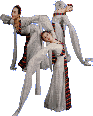 チベット民族は中国の西に定住し、標高3000mを超える青蔵高原で遊牧生活をしている中国民族の一つです。 舞踊の特徴: "一順邊”頭から腰まで上半身はリラックスして自然に左右に揺らしている。腰は前に90度曲げている特別な姿勢がある。よく使われる「哈達(ハーダ)」(真っ白の長い絹)、は大切なお客様への贈り物である。