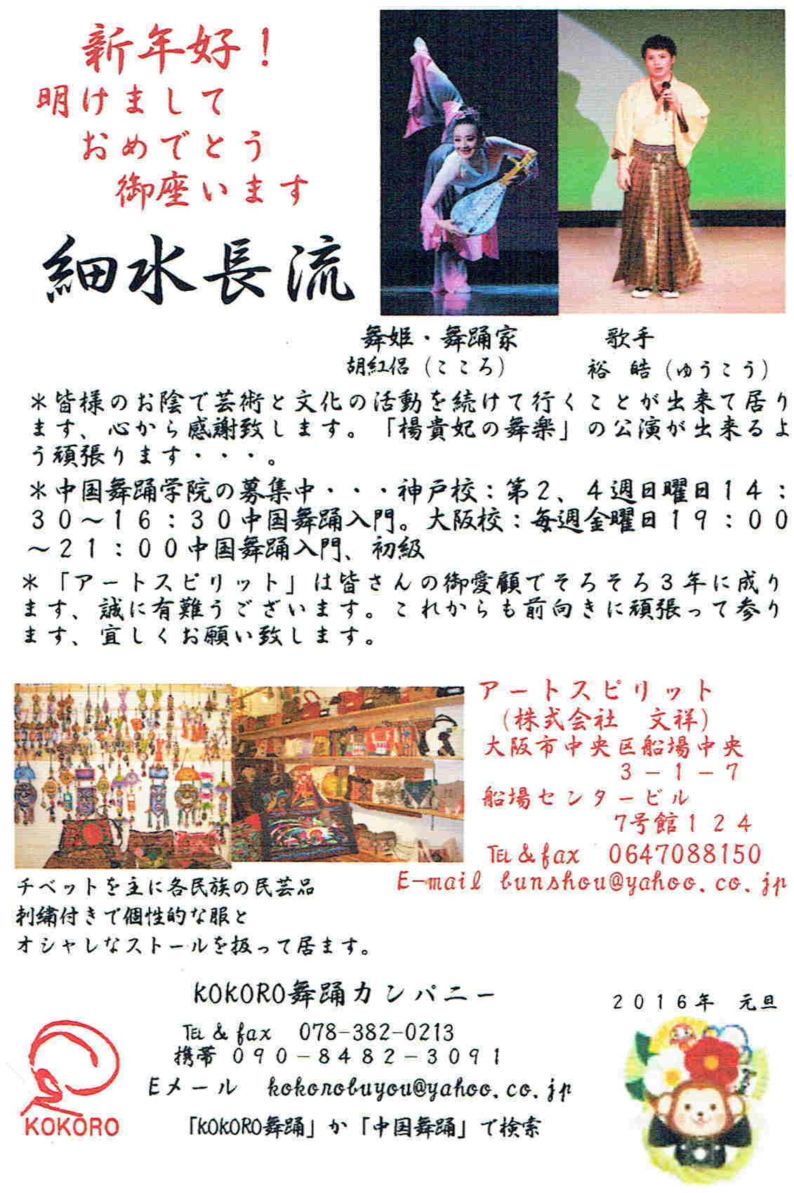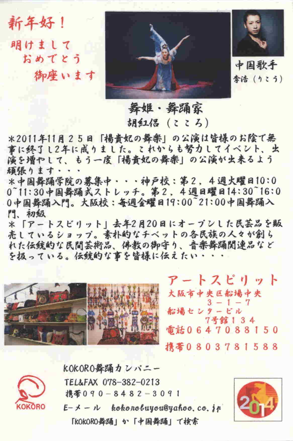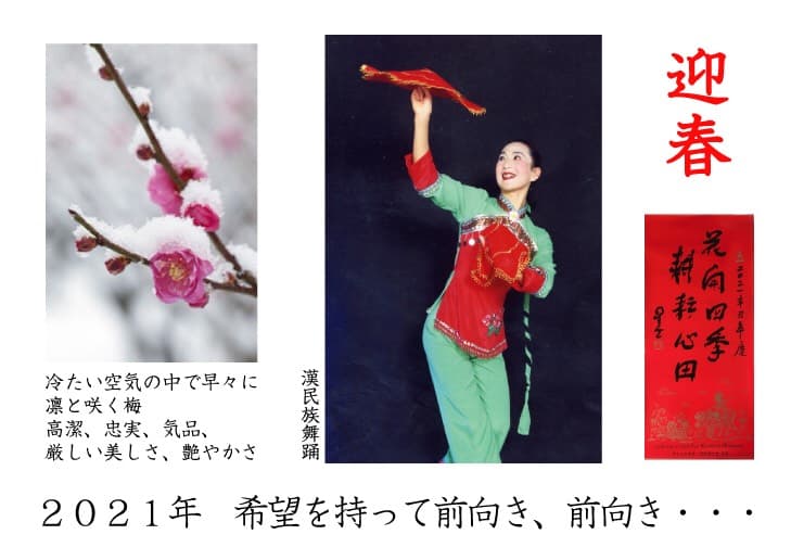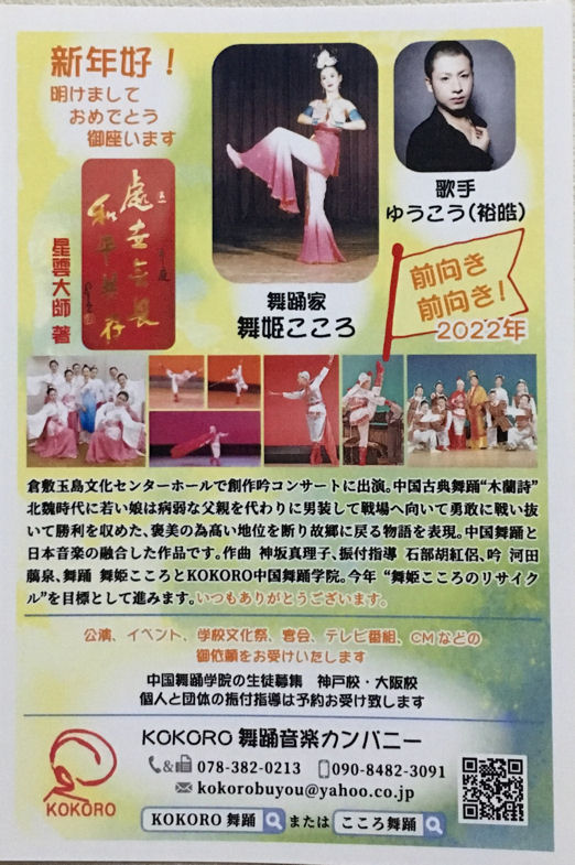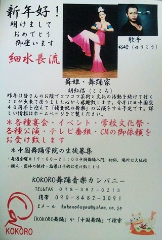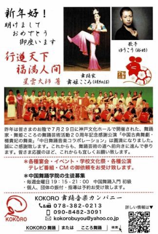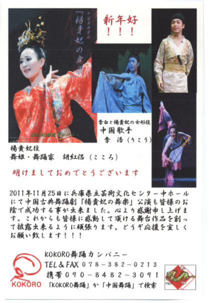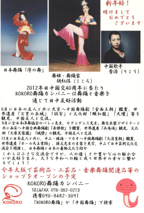 | あけましておめでとうございます。 新年好 2012年日中国交40周年に当たり、皆様のお陰で KOKORO舞踊カンパニーは舞踊と音楽を通じて 日中友好交流会を開催する事が出来ました。 心から感謝致します。 小さな交流会ですが、人の優しさや豊かな心の 触れ合いが友好を生み、大きな平和への輪と成り 世界中の幸せに繋がって行く事と信じています。 ![]() |