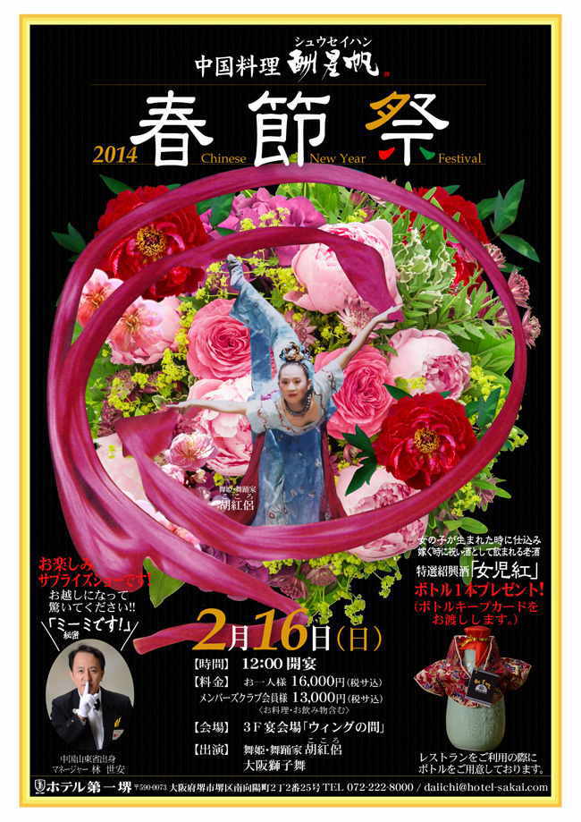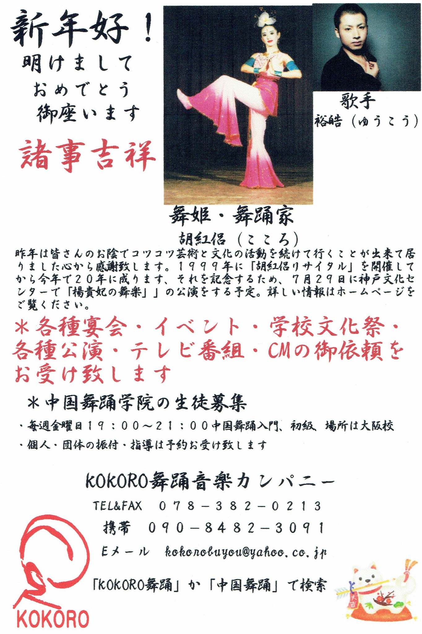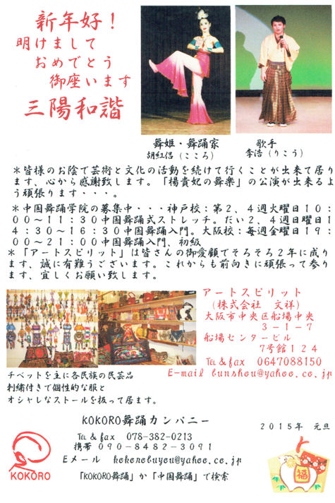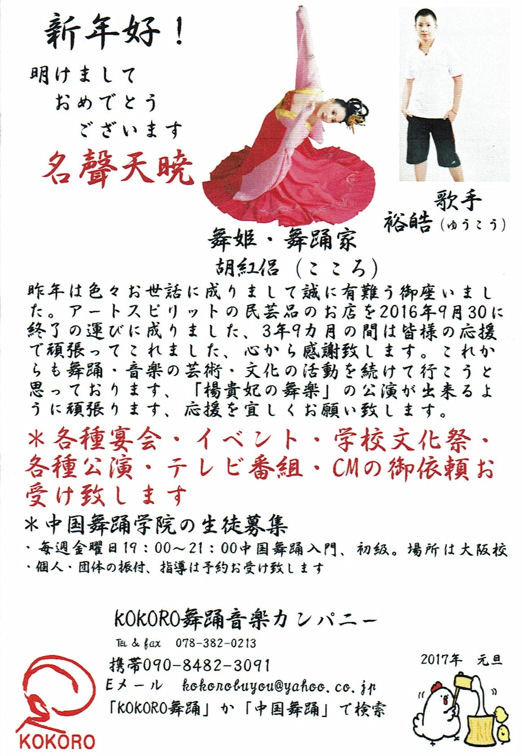 | 新年好 昨年は皆さんのお蔭でコツコツ芸術と文化活動を続けることが出来まして心より感謝致します。1999年に「胡紅侶リサイタル」を開催してから今年で20年になります。それを記念する為7月29日に神戸文化ホールで「楊貴妃の舞楽」の公演をする予定です。詳しい情報はホームページをご覧ください。 ![]() |