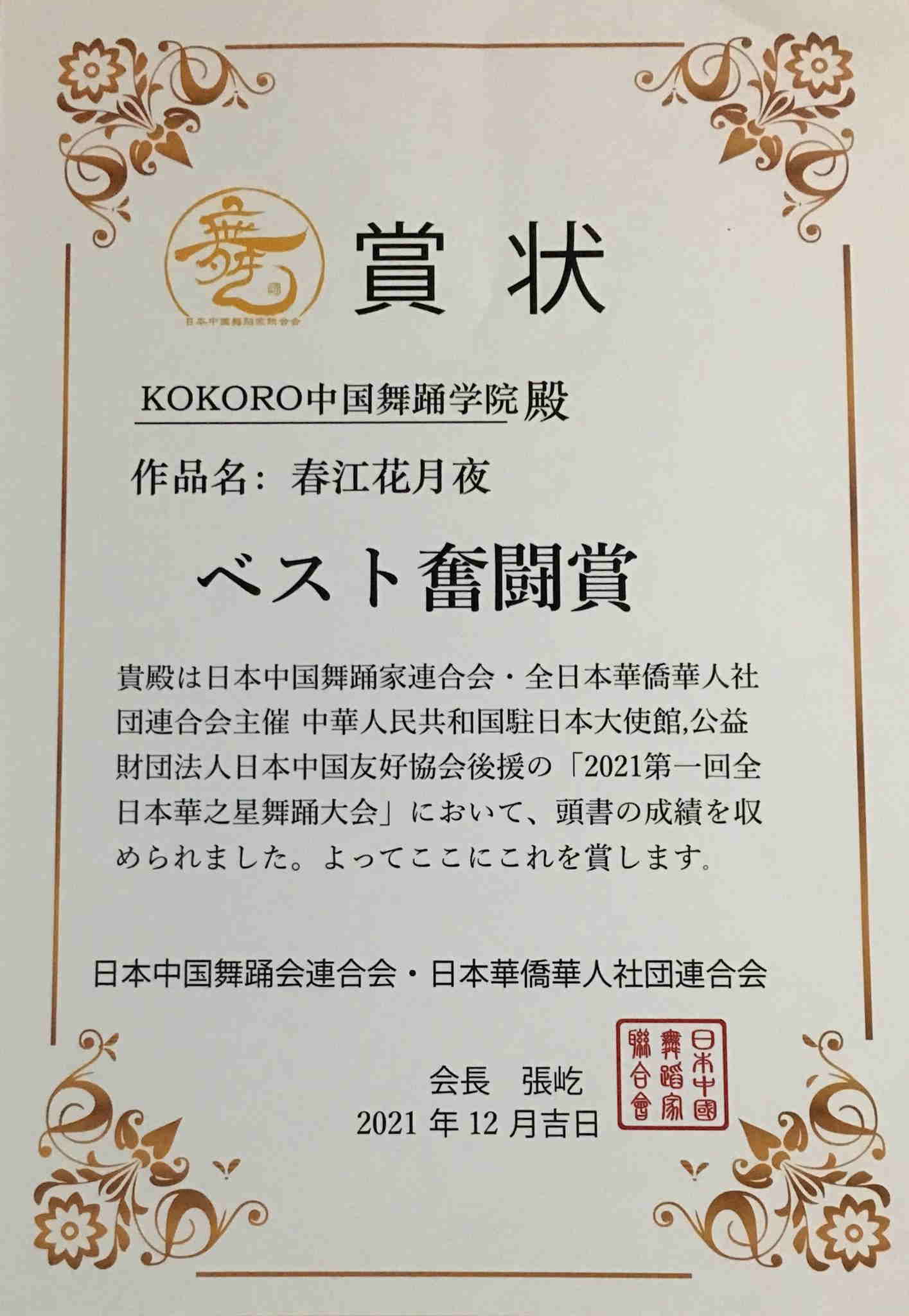 KOKORO中国舞踊学院学生は日本中国舞踊会連合会が主催、“2021第一会全日本華之星舞踊大会”にベスト奮闘賞をいただきました。 出演者 赤司知江美、溤春苗、杜偉、玉城楓子、引地都子、王孟禹、坂口知保 振付指導 石部胡紅侶(こころ先生) |