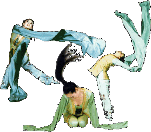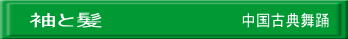 袖と髪: “袖”は又“水袖”とよばれる。唐の時代にまでさかのぼり、“水袖”は中国古典舞踊の一つです。唐時代の宮廷舞踊の中「白寧舞」は代表的な“水袖”の踊りです。その水袖は又は伝統劇の中で使われて発展しています。水袖の基本的な振りは振ったり、放ったり、投げたり、掴んだりすることです。表現される人物によって使っている水袖は様々で、その表現はとても高い芸能です。水袖の踊りは特別な旋律を持っている。 |