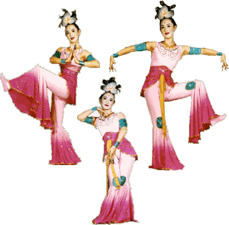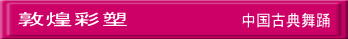 敦煌舞踊 : 敦煌舞踊は中国古典舞踊の一つである。中国のシルクロードの敦煌という所に世界遺跡の“莫高窟”があり、その“莫高窟”に1600年前の千姿百態な仏像彫刻、壁画が残されている。舞踊芸術家はその千姿百態な仏像彫刻、壁画の造形を舞踊質材として“敦煌舞踊”を作った。舞踊特徴は身体でSの字を作りながら静と動を組み合わせている。 敦煌彩塑 : 敦煌彩塑は中国古典舞踊の中に敦煌舞踊である。仏像彫刻壁画の復活と、しとやかで質素な女性を表現し叙情的な美しい絵がゆったりと流れ、漂っている様子を表現している |
