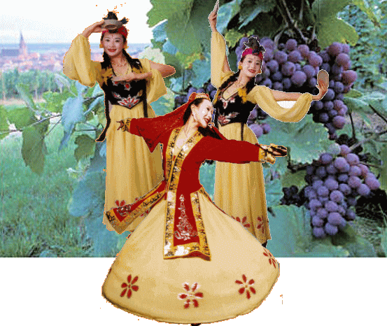 ウィグル民族舞踊 : ウィグル民族は中国北西部の天山山脈南に定住しています。言葉はウィグル語、宗教はイスラム教です。 舞踊特徴 : 顎、胸、腰を上げる姿勢、ひざを震わせ、頭から目,首、肩、手、脚、指先までそれぞれ動きがあり、特に目元をよく使って感情表現をします。"軟腰"(腰を左右後に曲げる)や快速なシェネのあとでのストップするテクニックは見事です。 葡萄園の少女: 美しいウィグル族の少女が葡萄園の中を小鳥のように飛んだり跳ねたり回ったりして葡萄園祭りを祝う踊りです。 (葡萄はウィグル族の名物で、見渡す限りの葡萄園が広がっています) |